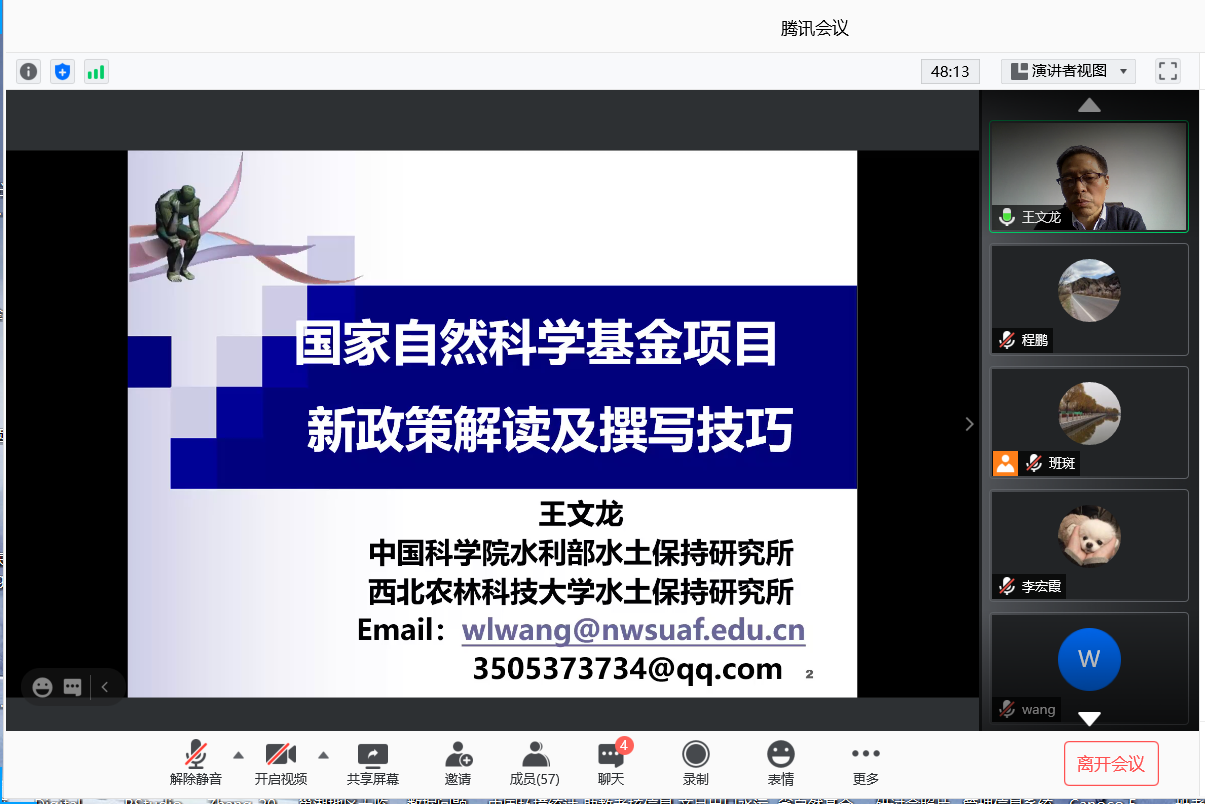 报告人简介:王文龙,男,1964年7月生,博士,研究员,博导。现任中国水土保持学会土壤侵蚀专业委员会主任,中国治沙暨沙业学会理事,陕西省矿区生态修复重点实验室学术委员会副主任,黄土高原水土保持与生态修复国家林业和草原局重点实验室学术委员会委员,曾任神木侵蚀与环境试验站站长。《水利水电技术》杂志特邀副主编,榆林学院兼职教授。2004年在西北农林科技大学获农学博士学位,并获陕西省优秀博士学位论文,2004-2007年在清华大学水利系做博士后研究工作。先后主持国家重点研发计划专题、国家科技支撑项目专题、国家自然科学基金、中国科学院西部行动计划、水利部公益性行业专项等国家及省部级课题30余项。主要研究方向为土壤侵蚀过程与机理、生产建设项目土壤侵蚀与水土保持。获得省部级科技成果一等奖3项、二等奖和三等奖各1项,参编专著2部,发表论文150余篇,其中SCI/EI收录40余篇。长期关注国家自然科学基金资助政策变化、基金写作技巧及评选规律,提炼总结了基金撰写要点、重点和难点等关键问题,具有深层次的基金认识和丰富的指导经验,曾受邀在全国相关高校和科研院所做基金辅导讲座80余场次。