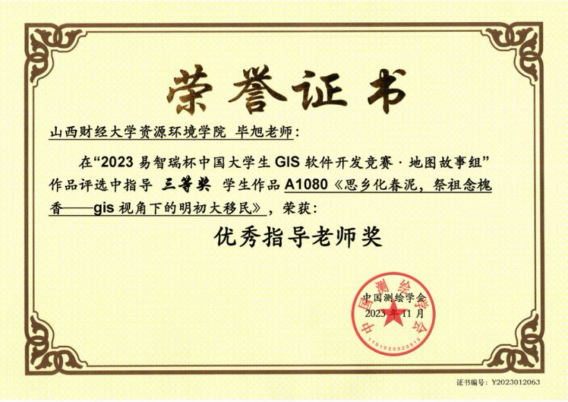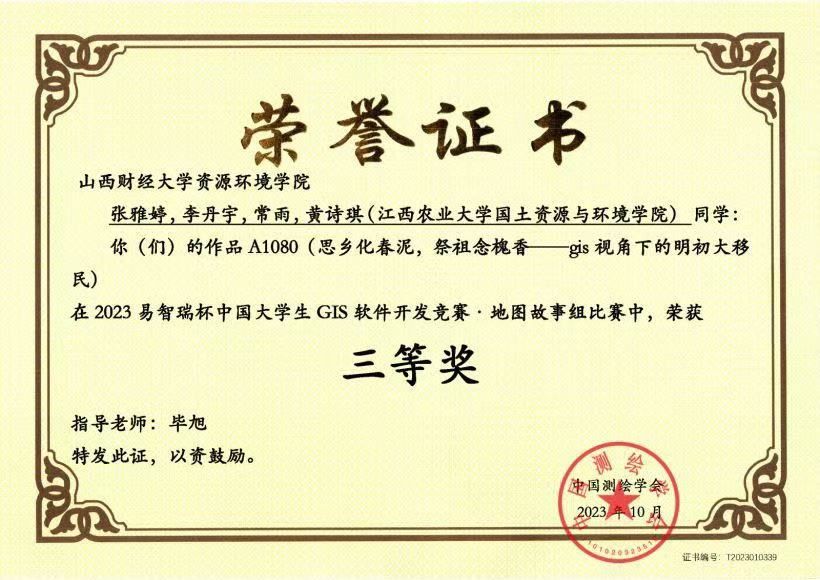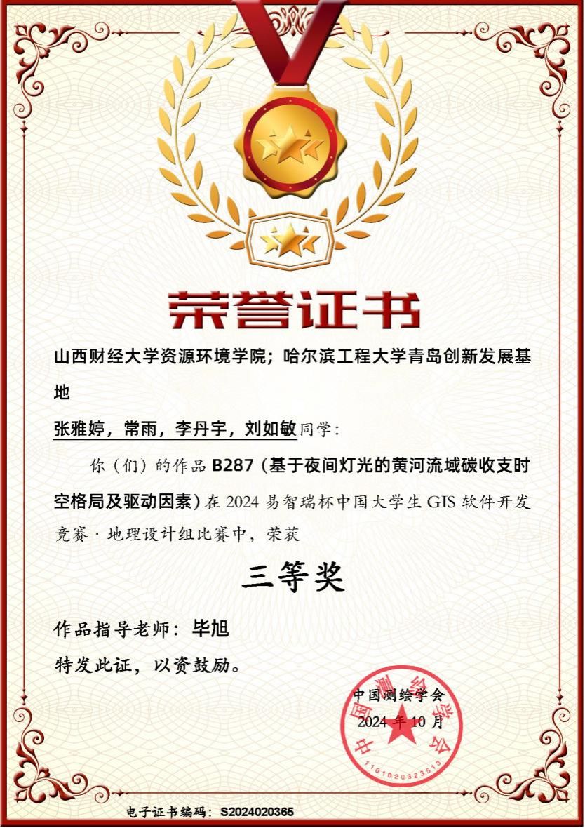 2024年“易智瑞杯”中国老员工GIS软件开发竞赛评选结果正式揭晓!beat365唯一官网2021地理信息科学专业张雅婷、常雨、李丹宇三位同学的作品《基于夜间灯光的黄河流域碳收支时空格局及驱动因素》荣获地理设计组三等奖。其中,该团队成员在2023年“易智瑞杯”中国老员工GIS软件开发竞赛中作品《思乡化春泥,祭祖念槐香——gis视角下的明初大移民》荣获地图故事组三等奖。以上荣誉不仅是对团队成员辛勤付出的肯定,更是对公司在培养高素质GIS人才方面所取得成绩的认可。指导教师毕旭老师荣获“优秀指导老师”奖项,她的专业指导和无私奉献为团队成功奠定了坚实的基础。