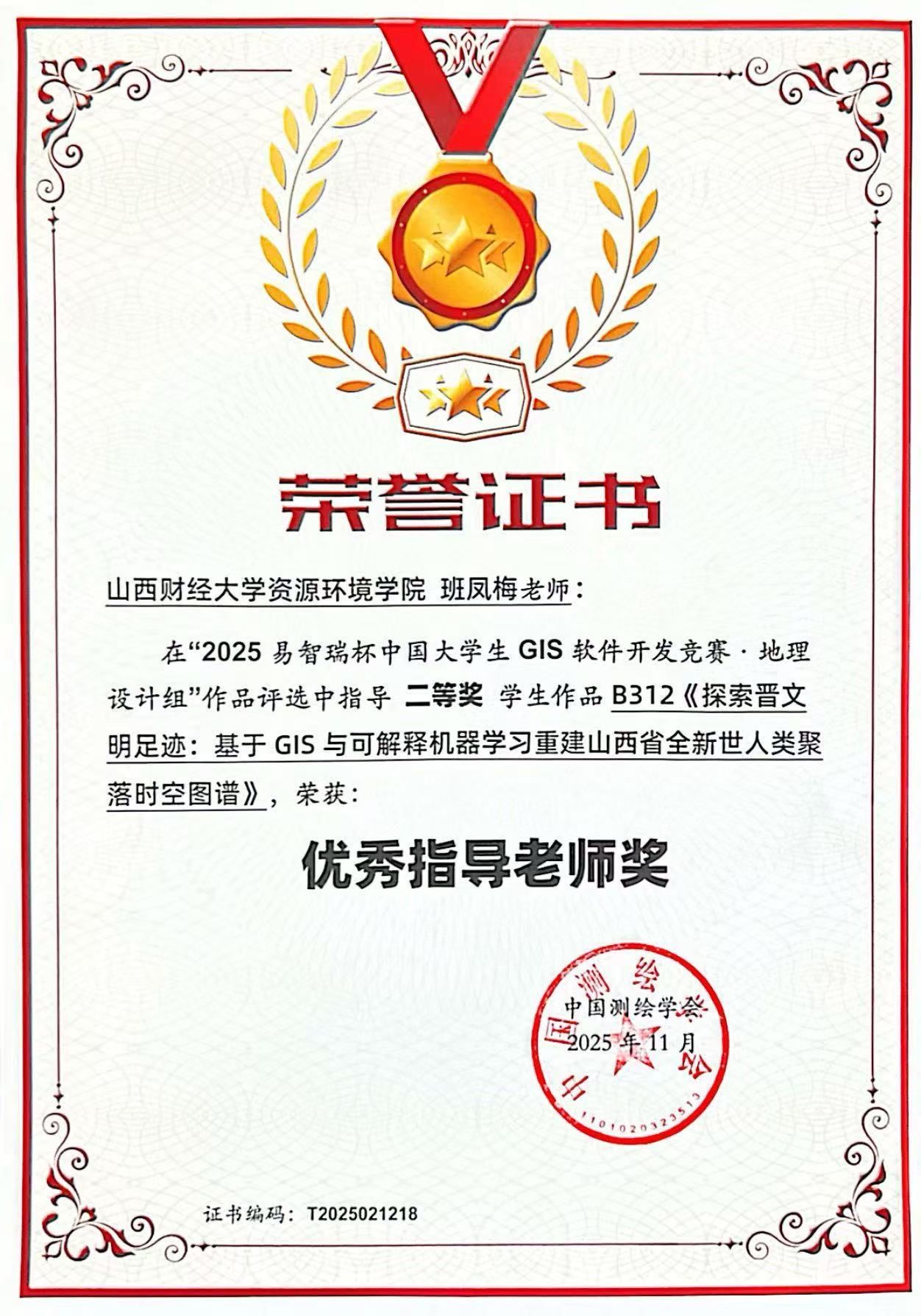近日,2025年“易智瑞杯”中国老员工GIS软件开发竞赛圆满落幕。本届竞赛作为中国GIS领域最具影响力的创新型赛事,数千名优秀学子同台竞技,beat365唯一官网2023自然地理与资源环境班张晟辉、孙亦通,2022自然地理与资源环境班成芮娴三位同学表现优异,团队参赛作品《探索晋文明足迹:基于GIS与可解释机器学习重建山西省全新世人类聚落时空图谱》,凭借扎实的研究基础与创新的技术融合,在全国众多参赛作品中脱颖而出,荣获地理设计组全国二等奖,作品指导老师班凤梅教授荣获“优秀指导老师”奖。