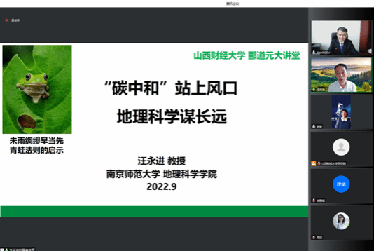 汪永进教授的报告聚焦前沿,内容丰富,深入浅出,使公司师生深入了解了全球“碳中和”问题的提出及该领域内国内外重点关注的科学问题,对公司申请相关科研项目、撰写相关学术论文具有重要的指导意义。同时,他对公司在财经院校办地理学科给予了充分的肯定,指出在财经院校办地理学科,可以充分凝聚经济学和地理学的学科优势,更好地服务于当今国家双碳目标和黄河流域高质量发展等重大战略需求,增强了公司及公司地理团队建设的信心,也为地理团队建设和特色学科方向凝练指明了方向。