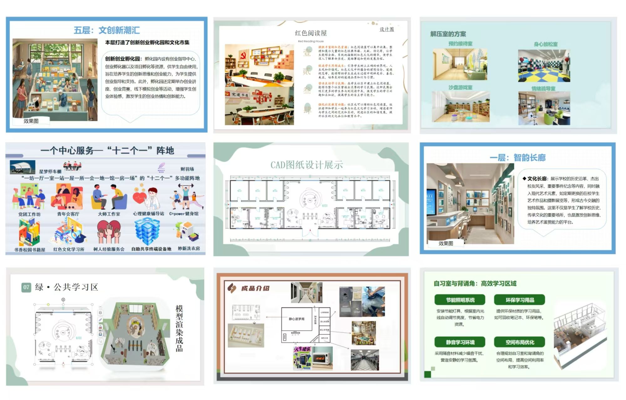 决赛环节分为项目展示和评委问答两个部分。在项目展示环节中,各参赛队伍围绕“科技宿宇,创意展辉”:以宿舍楼宇为基础,模型设计创意为主线,设计员工“一站式”员工社区空间实物模型,运用PPT、手绘图纸、实物模型进行展示。参赛选手们详细介绍了“一站式”员工社区模型作品的设计理念、创作过程、实用性能等方面,将党员活动室、红色阅读室、青年会客厅、心理服务站、社区健身房等各类功能性空间作为创新点,融管理性、实用性、生态性、环保性和科技性于一体,将所学专业知识用于作品创作中。在评委问答环节中,评委老师现场提问,各参赛队伍围绕“废材新用,绿梦成真”:将变废为宝制沙盘,绿色环保理念得理念贯穿始终,对如何运用科技创新等手段赋予废旧物品新的生命,减少环境污染,实现资源循环再利用进行现场答辩。各参赛队伍的设计作品特色鲜明、亮点突出,比赛现场气氛热烈。