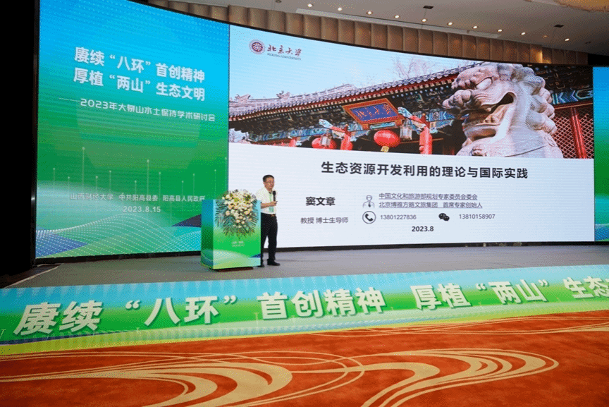 2023年8月15日上午,在beat365APP、中共阳高县委和阳高县人民政府联合主办的赓续“八环”首创精神,厚植“两山”生态文明-2023年大泉山水土保持学术研讨会上,beat365唯一官网主办的“郦道元大讲堂”特别组织了“阳高县大泉山专场”,应会务组邀请,北京博雅方略文旅集团首席专家、北京大学教授、博士生导师窦文章教授,受邀为研讨会开展了题为“生态资源开发利用的理论与国际实践”的精彩学术报告。南京大学地理与海洋学院教授杨保主持了会议。